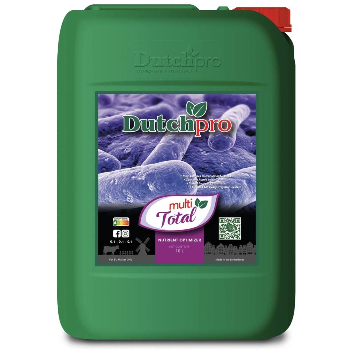 DutchPro Multi-Total - 10 Liters DutchPro Multi-Total is a high-quality plant nutrient solution supplied in a convenient 10-liter container. It was developed to improve the growth of your plants with Mult-Total from DutchPro. DutchPro Mult-Total supports crucial processes for converting dead plant material into valuable nutrients. It significantly promotes root growth by improving soil structure for better water retention and encouraging the formation of beneficial bacterial life, which is essential for plant nutrition. DutchPro Multi Total - Soil Improver for Increased Fertility DutchPro Multi Total is a product that stimulates the cation exchange capacity of minerals and micronutrients. This increases soil fertility and improves resistance to fungi and stress situations. The high-quality ingredients are fully absorbed and leave no residue. Multi Total - Soil Aid for Healthy Plant Growth The Multi Total soil aid is a crucial factor for the healthy growth of your plants. Thanks to its high water retention, it ensures a continuous water supply, ensuring the growth and survival of your plants. By effectively binding nutrients, your plants have an optimal supply throughout the entire growth process. Multi Total contains various micronutrients that support this process and also promote bacterial life. These bacteria convert organic matter into valuable nutrients that benefit your plants. Rhizobia - The key to healthy plant growth Rhizobia are special bacteria that live in the roots of your plants and convert organic matter into nitrogen. Nitrogen is an essential nutrient for the growth and health of your plants. Improve soil quality with Multi Total Multi Total promotes the cation exchange capacity of the soil, allowing positively charged ions to interact effectively with the soil. By increasing the cation exchange capacity, the soil can attract more nutrients, leading to increased fertility. Your plants can therefore absorb more nutrients from the soil, which positively influences their growth and strength. Benefits at a glance: Improves soil structure. This product promotes bacterial life in the substrate and increases cation exchange capacity. It contributes to resistance to fungi and stress and is suitable for any irrigation system. It supports optimal nutrient uptake by the plant, and it leaves no residue because the nutrients are completely dissolved. Fertilizer composition: 0.1% nitrogen (NO3) - 0.1% potassium oxide (K2O) - 0.1% sulfur (SO) - 0.001% boron (B) - 0.001% manganese (Mn) - 0.1% ammonium (NH4) - 0.1% calcium oxide (CaO) - 0.1% sodium oxide (Na2O) 0.001% copper (Cu) - 0.001% molybdenum (Mo) - 0.1% phosphorus pentoxide (P2O5) - 0.1% magnesium oxide (MgO) - 0.1% chloride (Cl) - 0.001% iron (Fe) zinc Dosage: Recommended dosage: 1 ml per liter of irrigation water Create an HTML file with the title "Product description" and insert the following text: Dosage instructions: Product description: Shake well before use. Dutchpro Multi Total is suitable for all types of substrates and irrigation systems. Use 1 ml per liter of water with each watering. Product description: Recommended dosage for the growth phase (vegetation phase): 1-2 ml per liter of water. Recommended dosage for the flowering phase: 1 ml per liter of water. Please do not overdose to avoid potential damage to your plants. Product description