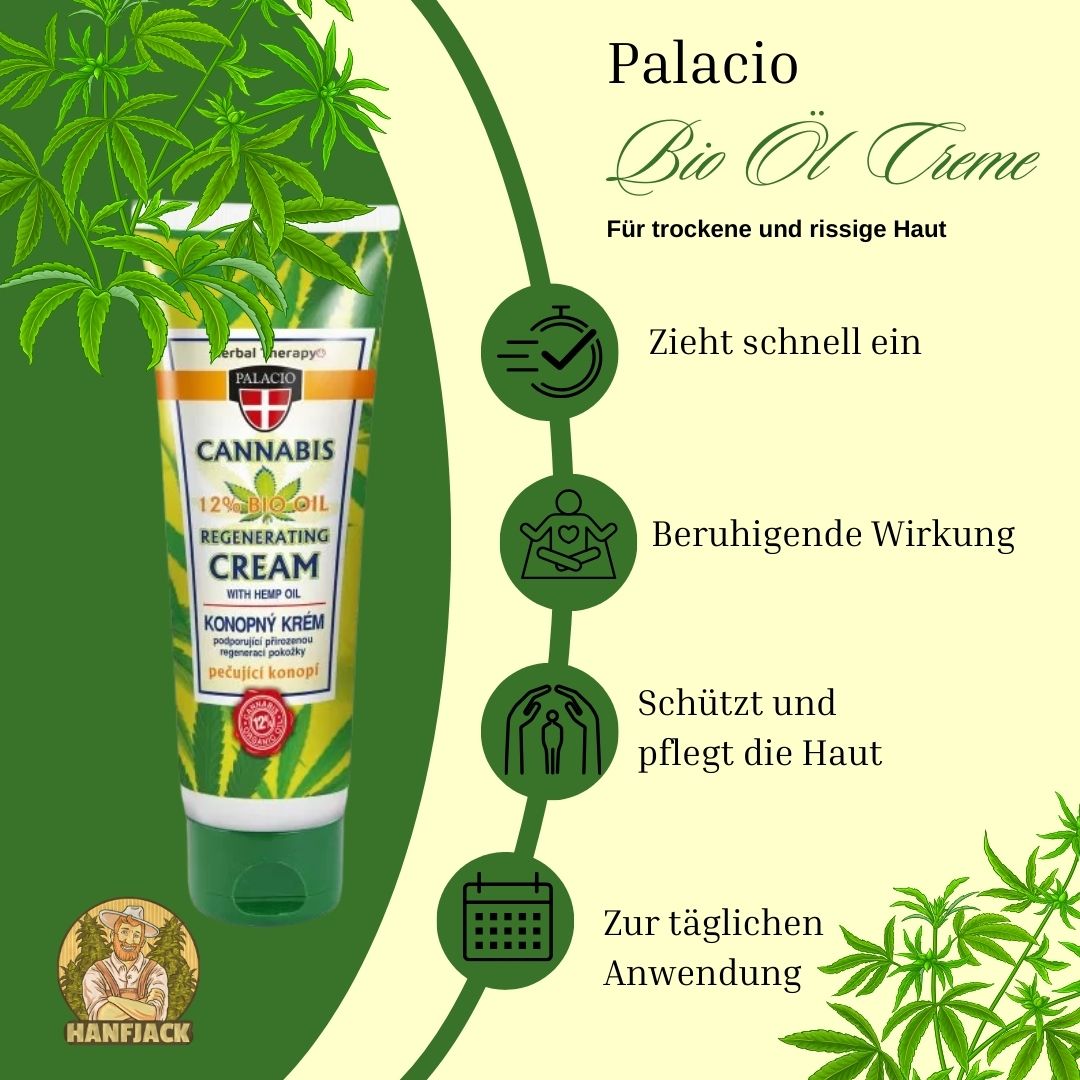 Geben Sie Ihrer Haut die Pflege, die sie verdient, mit der Palacio Cannabis Bio Öl Creme regenerierend. Diese intensive Pflegecreme enthält hochwertiges Hanfsamenöl, das speziell dafür entwickelt wurde, trockene, rissige und empfindliche Haut zu regenerieren und zu schützen. Die reichhaltige Formel sorgt für tiefe Hydratation und hilft, die Haut vor schädlichen Umwelteinflüssen zu bewahren. Produktdetails: Inhaltsstoffe: Hanfsamenöl: Regeneriert die Haut intensiv und spendet tiefgehende Feuchtigkeit. Anwendungsbereich: Ideal für trockene, rissige und empfindliche Haut, besonders nach dem Sonnenbaden, Schwimmen oder Baden. Vorteile: Tiefe Hydratation: Die Creme versorgt die Haut mit intensiver Feuchtigkeit und beruhigt sie. Schutz vor Umwelteinflüssen: Die Formel schützt die Haut vor den schädlichen Auswirkungen von Umweltfaktoren. Vielseitig einsetzbar: Geeignet für die tägliche Pflege, insbesondere nach dem Sonnenbaden oder Schwimmen. Für alle Hauttypen: Die Creme ist sanft genug für alle Hauttypen, ideal für empfindliche Haut. Anwendung: Tragen Sie die Palacio Cannabis Bio Öl Creme nach dem Baden, Sonnenbaden oder Schwimmen auf die trockene Haut auf. Massieren Sie die Creme sanft ein, bis sie vollständig eingezogen ist, um optimale Ergebnisse zu erzielen. Inhalt: Größe: 125ml Tube, praktisch für den täglichen Gebrauch und unterwegs. Warnhinweise: Nicht für Kinder unter 3 Jahren geeignet. Besondere Eigenschaften: Schnelles Einziehen: Die Creme zieht schnell ein und hinterlässt die Haut weich und geschmeidig, ohne ein fettiges Gefühl. Beruhigende Wirkung: Dank des Hanfsamenöls wird die Haut beruhigt und regeneriert, was die natürlichen Heilungsprozesse unterstützt. Schutz und Pflege: Schützt die Haut vor schädlichen Umwelteinflüssen und pflegt sie intensiv.