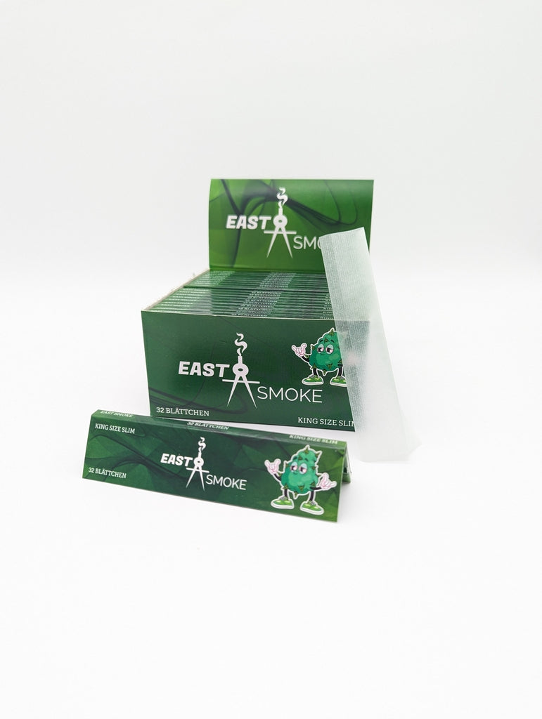 Du willst bestes Abbrennverhalten, geschmacksfreie Papers und einfach mal was anderes? Kannst Du haben: Mit unseren East Smoke King Size Papers in grün mit 3...