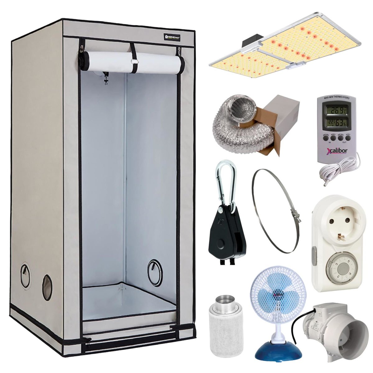 Das Ultimative Komplettset für Perfekte Pflanzenzucht Growbox Komplettset 100x100x200cm - Optimale Wachstumsumgebung für deine Pflanzen Alles, was Sie für ein erfolgreiches Indoor-Growing brauchen, ist in unserem kompletten Set enthalten. Die Homebox Ambient Q100+ (100x100x200 cm) steht im Fokus und gewährleistet eine ideale Reflexion von Licht und eine effiziente Regulierung der Wärme. In dieser Growbox gibt es genügend Platz und die perfekte Umgebung, in der deine Pflanzen wachsen. Effektive Geruchsbekämpfung mit dem Aktivkohlefilter Prima Klima EcoLine Aktivkohlefilter K2601 Der Aktivkohlefilter Airontek Aktivkohlefilter Durchmesser 125mm 425 m3beseitigt unerwünschte Gerüche verlässlich. Dieser Aktivkohlefilter bietet eine Filterleistung von 425 m3/h, wodurch in deinem Growroom eine frische und saubere Luft herrscht. Mit Vents In-Line Lüftern eine optimale Luftzirkulation erreichen Eine effektive Luftzirkulation, die für das gesunde Wachstum deiner Pflanzen unerlässlich ist, wird durch den „Vents In-Line Lüfter TT 125“ gewährleistet, der eine Leistung von 220–280 m3/h hat. Die Installation ist schnell und unkompliziert, wenn man den ALUconnect Lüftungsschlauch (127mm) und die Schlauchschelle (60-135 mm) verwendet. Qualitätsbeleuchtung und -zubehör Das „Spider Farmer SF2000 Samsung LM301H EVO“ LED-Pflanzenlicht eignet sich hervorragend zur Beleuchtung der Blüte- und Wachstumsphase deiner Pflanzen. Die kleinen Karabiner und die Lumen King Heavy-Duty Rope Ratchets (68 kg) ermöglichen es dir, die Lampen sicher und flexibel zu hängen. Genaue Kontrolle und Monitoring Mit dem Airontek Thermo-Hygrometer mit Sensor kannst du die Temperatur und die Luftfeuchtigkeit präzise überwachen. Der Airontek Clip Fan 15w stellt sicher, dass die Luft in der Growbox gleichmäßig verteilt ist. Die Legrand mechanische Zeitschaltuhr , die mit LEDs ausgestattet ist, ermöglicht es dir, die Beleuchtungszeiten exakt zu regulieren. Ihr ganzheitliches Paket für erfolgreiches Indoor-Growing Für jeden Indoor-Grower, der höchstmögliche Resultate erzielen will, ist dieses Komplettset die ideale Option. Beginne dein erfolgreiches Indoor-Growprojekt mit der Bestellung des Homebox Ambient Q80+ Komplettset noch heute! Growbox Komplettset 100x100x200cm Im Set enthalten: Homebox Ambient Q100+ (100x100x200 cm) Spider Farmer SF2000 Samsung LM301H EVO LED (200 W) Vents In-Line Lüfter TT 125 - 220–280 m3/h ALUconnect Lüftungsschlauch (127mm) Schlauchschelle (60-135 mm) Lumen King Heavy-Duty Rope Ratchets (68 kg) Airontek Thermo-Hygrometer mit Sensor Airontek Clip Fan 15w Prima Klima EcoLine Aktivkohlefilter K2601