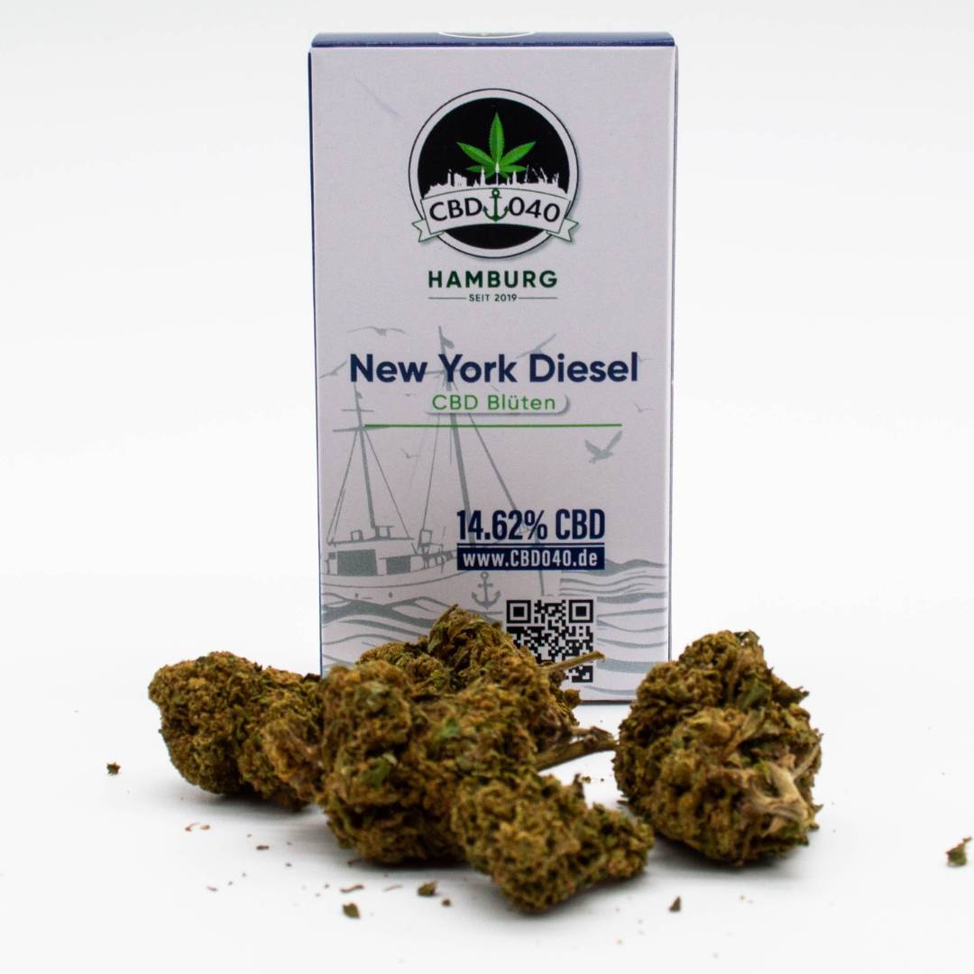 Unsere Premium CBD Blüten Sorte, direkt aus dem Big Apple: CBD New York Diesel 040Dürfen wir vorstellen? Die New York Diesel CBD Blüten ist eine hochwertige CBD Blüte, die für ihre erstaunlichen Eigenschaften und ihren Geschmack bekannt ist. Mit einem CBD Gehalt von 14,62% und einem THC-Gehalt von unter 0,2% ist diese Sorte ideal für alle, die die Vorteile von CBD genießen möchten, ohne sich um psychoaktive Wirkungen sorgen zu müssen.Keyfacts zu New York Diesel 040 CBD BlütenKeyfactsDetailsTHC-GehaltUnter 0,3% (legal in Deutschland)CBD-Gehalt14,62%SorteSativa-dominantGeschmackErdige Aromen mit Diesel-NotenWirkungBeruhigend, stresslösend, entspannendGeeignet fürStressabbau, Entspannung, allgemeines WohlbefindenBesonders geeignet fürAnwender, die therapeutische Vorteile von CBD genießen möchten, ohne psychoaktive WirkungenRechtlicher Hinweis100% legal in Deutschland, nicht zum Verzehr geeignet, Abgabe ab 18 Jahren, nur für gewerbliche oder wissenschaftliche Zwecke Die Blüten der New York Diesel CBD-Sorte haben einen einzigartigen, erdigen Geschmack, der mit einem Hauch von Diesel-Noten verfeinert wird. Sie sind sorgfältig gezüchtet und handverlesen, um eine gleichmäßige Qualität und einen optimalen CBD-Gehalt zu gewährleisten. Die Blüten sind auch reich an Terpenen, die für ihre beruhigenden und therapeutischen Eigenschaften bekannt sind.Wenn Sie nach hochwertigen CBD-Blüten suchen, die sowohl geschmackvoll als auch wirksam sind, ist die New York Diesel CBD-Sorte die perfekte Wahl. Mit einem hohen CBD-Gehalt und einem niedrigen THC-Gehalt ist sie ideal für alle, die die therapeutischen Vorteile von CBD nutzen möchten, ohne dabei in den Genuss von psychoaktiven Wirkungen zu kommen.New York Diesel 040 CBD Blüten haben folgende Werte:THC: < 0,2 %CBD: < 14,62 %100% Legal in DeutschlandHinweis & GebrauchsanweisungBei CBD 040 Buds handelt es sich um einen Rohstoff zur Weiterverarbeitung:Herstellung von Naturkosmetikals Räucherware für StresstherapieAromatherapie etc.Nicht zum Verzehr geeignet // Für Kinder unzugänglich aufbewahren.EU Nutzhanfblüten Erzeugt keine psychoaktive Wirkung.Abgabe erst ab 18 Jahren!CBD Blüten sind ausschließlich nur für gewerbliche oder wissenschaftliche Zwecke zu verwenden. Die CBD Blüten werden als Rohstoff und landwirtschaftliches Produkt im Sinne der Urprodukteverordnung §1 Ziffer 7 online verkauft. Nicht zur Einnahme empfohlen, Verwertung untersagt. CBD Blüten ausschließlich als Rohstoff zur Weiterverarbeitung - Goods (bulk hemp and extracts) being sold solely as raw material for further processing.