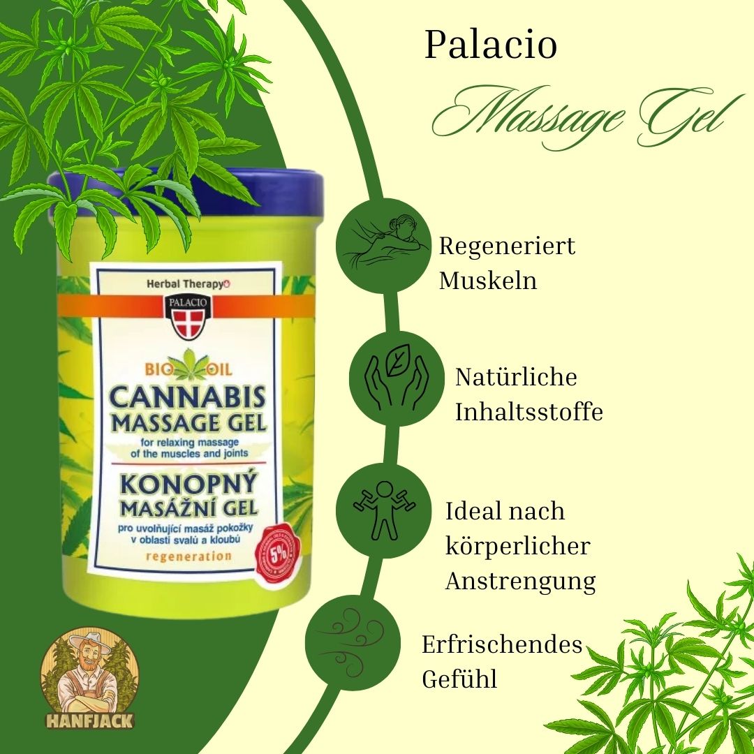 Das Palacio Cannabis Massagegel regenerierend - 380ml Dose ist die perfekte Wahl zur Entspannung müder Muskeln, Gelenke und Sehnen. Dieses hochwertige Kräutergel ist speziell formuliert, um eine effektive Linderung von Verspannungen und Schmerzen zu bieten. Es ist ideal für Sportler, körperlich arbeitende Menschen und alle, die eine wohltuende Massage zur Regeneration suchen. Entspannung und Regeneration: Fördert die Entspannung der Muskeln und unterstützt die Regeneration nach körperlicher Anstrengung. Natürliche Inhaltsstoffe: Angereichert mit Hanfsamenöl, Pfefferminze und Extrakten aus Kastanie, Beinwell, Kampfer und Eukalyptus. Vielseitige Anwendung: Ideal für Sportler, körperlich arbeitende Menschen und alle, die unter Verspannungen und Schmerzen leiden. Anwendung Einfach auf die Haut auftragen und sanft einmassieren, um die Wirkung zu verstärken. Die regelmäßige Anwendung nach dem Sport oder körperlicher Anstrengung kann die Regeneration unterstützen und für ein entspanntes Gefühl sorgen. Inhalt und Inhaltsstoffe Inhalt: 380ml Inhaltsstoffe: Hanfsamenöl, Pfefferminze, Kastanienextrakt, Beinwell, Kampfer, Eukalyptus Warnhinweise Nicht für Kinder unter 3 Jahren geeignet. Das Palacio Cannabis Massagegel regenerierend ist ein hochwertiges Kräutergel, das mit Hanfsamenöl und weiteren natürlichen Extrakten angereichert ist. Es bietet eine ideale Lösung zur Entspannung und Regeneration von Muskeln, Gelenken und Sehnen. Die einzigartige Formel kombiniert die wohltuende Wirkung von Pfefferminze, Kastanie, Beinwell, Kampfer und Eukalyptus, um eine umfassende Pflege und Linderung zu gewährleisten. Hanfsamenöl ist bekannt für seine entzündungshemmenden und schmerzlindernden Eigenschaften, was es zu einer hervorragenden Wahl für die Pflege beanspruchter Haut und Muskeln macht. Pfefferminze sorgt für ein erfrischendes Gefühl, während Kastanie und Beinwell zur Linderung von Schwellungen und Schmerzen beitragen können. Kampfer und Eukalyptus bieten zusätzliche beruhigende und kühlende Effekte, die die Wirkung des Massagegels verstärken. Mit einem großzügigen Inhalt von 380ml bietet das Gel eine lange Nutzungsdauer und ist somit eine kosteneffiziente Wahl für regelmäßige Anwender. Dank seiner einfachen Anwendung kann es problemlos in die tägliche Pflege- und Regenerationsroutine integriert werden. Kurzbeschreibung Produkt: Palacio Cannabis Massagegel regenerierend - 380ml Dose Vorteile: Entspannung und Regeneration von Muskeln und Gelenken Inhaltsstoffe: Hanfsamenöl, Pfefferminze, Kastanienextrakt, Beinwell, Kampfer, Eukalyptus Anwendung: Auf die Haut auftragen und sanft einmassieren Inhalt: 380ml Warnhinweise: Nicht für Kinder unter 3 Jahren geeignet
