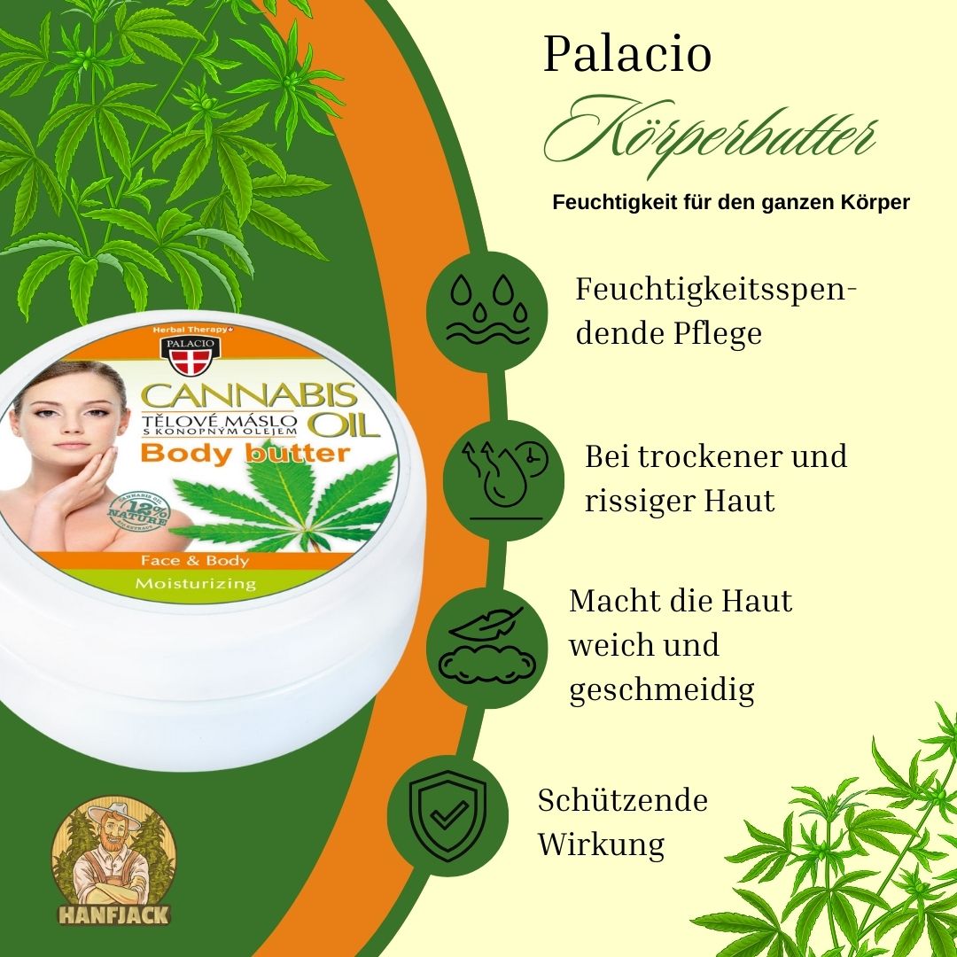 Die Palacio Cannabis Körperbutter mit Hanfsamenöl ist eine intensive, feuchtigkeitsspendende Pflege, die speziell für die Bedürfnisse besonders trockener und rissiger Haut entwickelt wurde. Diese reichhaltige Körperbutter kombiniert die heilenden Eigenschaften von Cannabisöl mit einer schützenden Formel, um Ihre Haut vor negativen Umwelteinflüssen zu bewahren. 🌱💧 Produktdetails: Inhaltsstoff: Hochwertiges Hanfsamenöl (Cannabis Sativa L.), das für seine feuchtigkeitsspendenden und heilenden Eigenschaften bekannt ist. 🌿 Anwendungsbereich: Geeignet für Gesicht und Körper, ideal zur Pflege von trockener und rissiger Haut. 💆♀️ Formel: Reichhaltige, cremige Textur, die tief in die Haut eindringt, um Feuchtigkeit zu spenden und die Haut weich und geschmeidig zu machen. ✨ Anwendung: Tragen Sie eine ausreichende Menge der Palacio Cannabis Körperbutter auf die betroffenen Hautstellen auf. Massieren Sie die Butter sanft ein, bis sie vollständig eingezogen ist. Ideal für die tägliche Anwendung nach dem Duschen oder Baden, um die Haut intensiv zu pflegen und zu schützen. 🚿🌸 Inhalt: Größe: 200g in einer praktischen Dose, ideal für den täglichen Gebrauch. 🏠 Besondere Eigenschaften: Pflegendes Hanfsamenöl: Das Cannabisöl versorgt die Haut intensiv mit Feuchtigkeit, fördert die Heilung und schützt vor weiteren Schäden durch Umwelteinflüsse. 🌱💧 Vielseitig einsetzbar: Diese Körperbutter kann sowohl im Gesicht als auch am Körper verwendet werden, um trockene und empfindliche Hautpartien zu pflegen. 💖 Schützende Wirkung: Die reichhaltige Formel bildet eine Schutzbarriere auf der Haut, die vor Austrocknung schützt und die Haut geschmeidig hält. 💪✨ Inhaltsstoffe: Vaseline, Mineralöl (Paraffinum Liquidum), Hanfsamenöl (Cannabis Sativa), Parfüm, CI 42051, Natriumchlorid, CI 19140