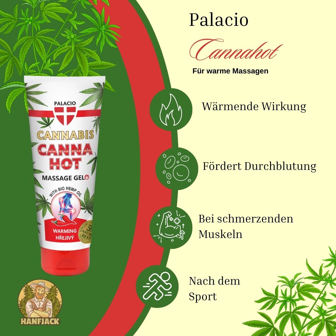 Das Palacio Cannahot Cannabis Massagegel wärmend - 200ml Tube ist speziell formuliert, um die lokale Durchblutung zu fördern und müde Muskeln sowie Gelenke aufzuwärmen. Mit einer einzigartigen Kombination aus Hanföl und aktiven natürlichen Substanzen ist dieses Gel ideal für eine entspannende Massage, die Steifheit reduziert und die Beweglichkeit verbessert. Erwärmende Wirkung: Fördert die lokale Durchblutung und erwärmt müde Muskeln und Gelenke. Natürliche Inhaltsstoffe: Enthält Hanföl sowie weitere aktive natürliche Substanzen und Extrakte. Vielseitige Anwendung: Ideal für entspannende Massagen zur Reduzierung von Steifheit und Verbesserung der Beweglichkeit. Anwendung Einfach auf die Haut auftragen und sanft einmassieren. Durch das Massieren der betroffenen Stelle wird die wärmende Wirkung verstärkt. Bei Bedarf die Anwendung wiederholen. Nicht für Kinder unter 3 Jahren geeignet. Inhalt und Inhaltsstoffe Inhalt: 200ml Inhaltsstoffe: Hanföl, natürliche Substanzen und Extrakte Warnhinweise Nicht für Kinder unter 3 Jahren geeignet. Das Palacio Cannahot Cannabis Massagegel wärmend ist ein hochwertiges Massagegel, das mit Hanföl und einer Vielzahl aktiver natürlicher Substanzen und Extrakte angereichert ist. Diese Kombination fördert die lokale Durchblutung und hilft, müde Muskeln und Gelenke aufzuwärmen, ideal für Entspannungsmassagen. Das Gel ist besonders nützlich für Menschen, die unter Muskelsteifheit und eingeschränkter Beweglichkeit leiden. Durch die regelmäßige Anwendung wird die Durchblutung verbessert und die Beweglichkeit gefördert, wodurch eine optimale Erholung und Entspannung ermöglicht wird. Die wärmende Wirkung des Gels macht es ideal für die Anwendung nach körperlicher Anstrengung oder bei Muskelverspannungen. Das Gel kann einfach auf die betroffenen Stellen aufgetragen und einmassiert werden, um die Wirkung zu verstärken. Mit einem Inhalt von 200ml ist das Gel kompakt und leicht zu handhaben, ideal für den täglichen Gebrauch. Die praktische Tube ermöglicht eine einfache Dosierung und Aufbewahrung. Kurzbeschreibung Produkt: Palacio Cannahot Cannabis Massagegel wärmend - 200ml Tube Vorteile: Wärmende Wirkung, fördert die Durchblutung, reduziert Steifheit und verbessert die Beweglichkeit Inhaltsstoffe: Hanföl, natürliche Substanzen und Extrakte Anwendung: Auf die Haut auftragen und sanft einmassieren, bei Bedarf wiederholen Inhalt: 200ml Warnhinweise: Nicht für Kinder unter 3 Jahren geeignet