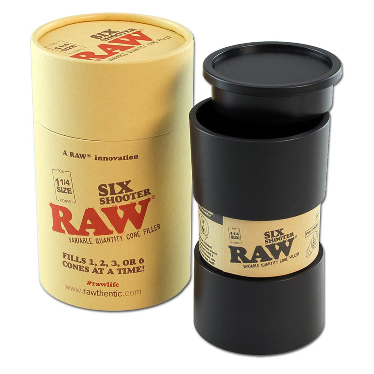 RAW Six Shooter Variable Cone Filler für 1¼‑Cones: Fülle 1–6 Cones gleichzeitig, kompakt, einfach, sauber – perfekt für effizientes Vorportionieren.